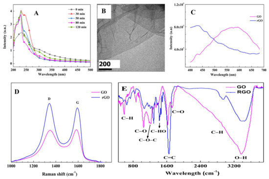 Characterization of graphene oxide (GO) and reduced graphene oxide (rGO). (A) UV-Vis absorption spectra at different reduction times when GO was reduced to rGO; (B) TEM image of rGO; (C) photoluminescent (PL), (D) Raman, and (E) FTIR spectra of GO and rGO.