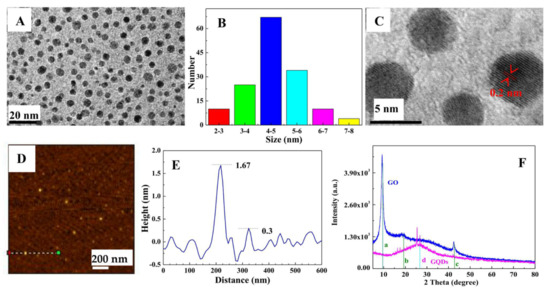 After the visible-Fenton reaction, the as-prepared GQDs have excellent dispersion in water and a narrow size distribution at 3–6 nm (Figure 2A,B); the HRTEM result indicated a regular crystalline structure with a lattice distance of 0.2 nm (Figure 2C and Figure S1), which is well-consistent with the published results [6,26,27]; the AFM pattern (Figure 2D,E) shows the height profile of GQDs is about 0.3–1.67 nm, corresponding to one to five layers of Gr. The above results coincide well with those of GQDs fabricated using the UV-Fenton method [26,27,28]. The XRD pattern of GO (blue curve in Figure 2E) shows three peaks at 9.56°, 19.18°, and 42.48°, which are the (001) and (002) planes of GO (PDF No. 00-065-1528), and the (100) plane of carbon (PDF No. 00-089-8498). The XRD pattern of GQDs (rose-red curve) shows a wide peak positioned at 26.6° is near to the (002) crystal face of exfoliated graphite [59], revealing the graphene structure of GQDs. According to the Debye–Scherrer equation, the calculated interplanar crystal spacing of GQDs is 0.365 nm, which is greater than that of graphite (0.335 nm) [59]. The main reason is that abundant oxygen-containing functional groups were formed on the lamellar surfaces or edges of the GQDs in the process of visible-Fenton reaction, resulting in GQDs possessing good water solubility.
