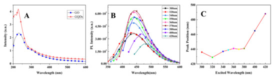 (A) UV-Vis absorption spectra of GQDs, GO is for comparison, (B) PL spectra of GQDs at different exciting wavelengths, and (C) PL peak positions changing with the excitation wavelengths.