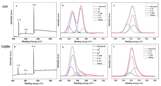 XPS spectra of GO (upper) and GQDs (lower). (A,D): survey scan spectra; (B,E): high resolution spectra of C1s; (C,F): high resolution spectra of O1s.