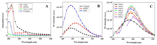 (A) UV-Vis absorption spectra of afGQDs, Anti-Lv-mAb and the conjugate of Anti-Lv-mAb/afGQDs; (B) PL spectra of afGQDs and Anti-Lv-mAb/afGQDs under excitation at 370 nm; and (C) PL spectra of Anti-Lv-mAb/afGQDs under various excitation wavelengths. In (A,B), GQDs is used as a reference.