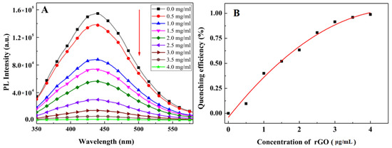PL quenching of Anti-Lv-mAb/afGQDs after addition of different amounts of rGO. (A) PL spectra, and (B) quenching efficiencies vary with the concentrations of rGO.