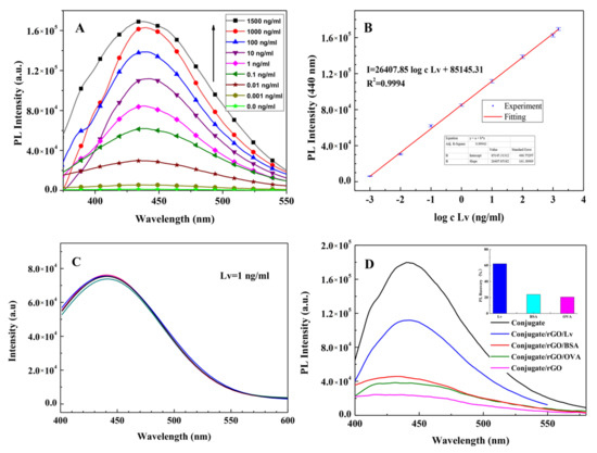 Upon the addition of the target antigen, Lv, into the Anti-Lv-mAb/afGQDs/rGO (conjugate/rGO) solution, the strong and specific immune reaction between Lv and Anti-Lv-mAb impelled rGO escaping from the complex of Anti-Lv-mAb/afGQDs/rGO, the PL of the conjugate was regained. With the subsequent increase in Lv, due to a large number of rGO departing from the Anti-Lv-mAb/afGQDs/rGO complex, resulting in the PL intensity enhancing (Figure 8A). The linear relationship between PL intensities (I) and logarithm of Lv concentrations (log c Lv) was shown in Figure 8B (calibration graph). The mathematical expression can be written as, I = 26,407.85 log c Lv + 85,145.31 with a regression coefficient (R2) of 0.9994. The LOD for Lv was found to be 0.9 pg/mL (S/N = 4), the linear detection range of 1.0 pg/mL–1500 ng/mL, and the sensitivity of 26,407.8 CPS/(ng/mL). Comparing to the current detection methods (Table 1), the PL “ON-OFF” technique in this work has a wide linear detection range, the almost lowest LOD, and high sensitivity. The detection time is 12 min, which is lower than that reported earlier [42].