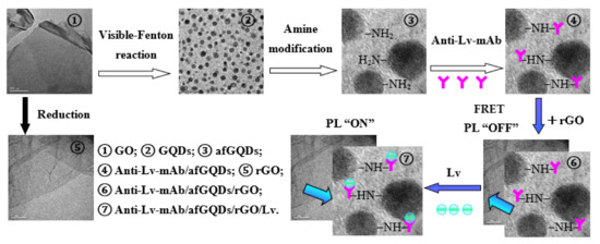 Inspired by this research and our previous study results, Lv, the main egg yolk protein derived from Vtg, was not only very stable, but also had the same binding efficiency to Anti-Lv-mAb as Vtg [55]. We established an ultrasensitive label-free “ON-OFF” immunosensor for detecting the Lv of Paralichthys olivaceus. The experimental procedure is in Scheme 1. With graphene oxide (GO) as a precursor, blue fluorescent GQDs were fabricated by using the visible-Fenton reaction. Furthermore, the morphology, size, structure, surface chemistry, and photo-physical properties of the GQDs were well characterized using a transmission electron microscope (TEM), high-resolution transmission electron microscope (HRTEM), atomic force microscope (AFM), X-ray diffractometer (XRD), Raman/Fourier transform infrared (FTIR), X-ray photoelectron spectrometer (XPS), and various other optical spectroscopy techniques. Using the amine-functionalized GQDs (afGQDs) conjugated to Anti-Lv-mAb as a fluorescent probe (afGQDs-Anti-Lv-mAb), an immunosensor for detection of the Lv of Paralichthys olivaceus was developed based on the FRET strategy, in which reduced GO (rGO) was used as an acceptor (quencher) and afGQDs-Anti-Lv-mAb as a donor. The quenched fluorescence could be recovered upon the addition of the target antigen Lv into the Anti-Lv-mAb/afGQDs/rGO (conjugate/rGO) solution. The fluorescence recovery degree is proportional to the concentration of Lv, which was used to determine the concentration of Lv. Our results indicated the visible-Fenton reaction is an easy, mild, green, efficient, and general approach to obtain GQDs; the FRET strategy for detection of Lv has high merit, not only for the wide linear test range (0.001–1500 ng/mL), lower limit of detection (LOD, 0.9 pg/mL), excellent sensitivity (26,407.8 CPS/(ng/mL)), selectivity, and reproducibility for Lv quantification, but also non-toxicity, safety for humans and the environment, easy-to-use, and time-saving.