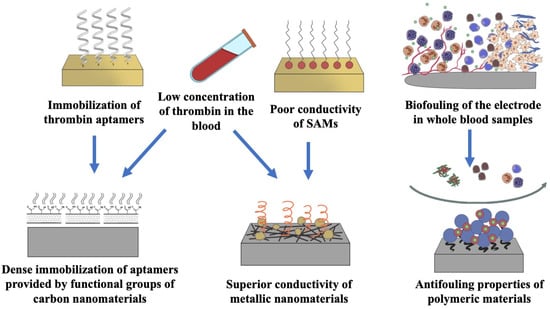 Immobilization of aptamers, low concentration of thrombin in the blood, poor conductivity of SAMs, and biofouling of electrodes in whole blood are the main challenges in the electrochemical detection of thrombin. These issues and problems could be resolved by utilizing nanomaterials and nanostructures.