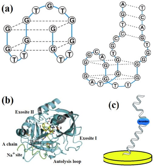 (a) G-quadruplex structure of Apt15 and Apt29, and (b) binding sites of thrombin. Adapted from [3]. (c) Sandwich assay setup utilizing both thrombin aptamers. Adapted from [61].