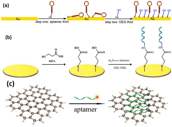 Aptamer immobilization via Au-S bonds (a), adapted from [68]; covalent attachment (b), adapted from [33]; and direct π-π stacking (c), adapted from [70], respectively. Incubation with OEG thiol in (a) blocks available functional groups after aptamer immobilization, thereby reducing nonspecific protein adsorption.