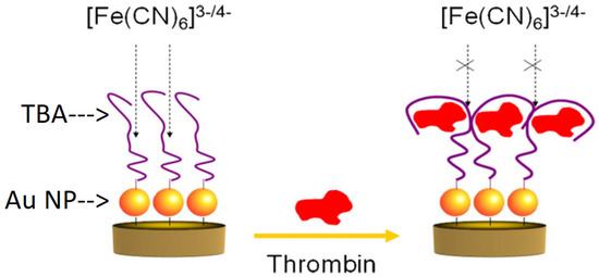 Au NP enabled thrombin biosensors. Conformational changes of TBA (immobilized on Au NPs) upon binding to thrombin vary the charge transfer resistances in the presence of [Fe(CN)6]3−/4− redox couple. Adapted from [76].