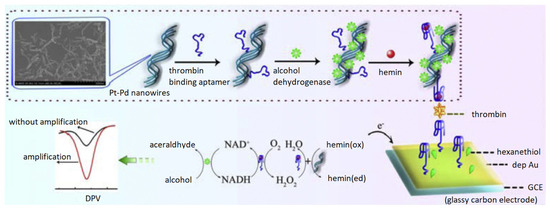 A more representative study in exploiting nanowires’ electrocatalytic activity for thrombin sensing was carried out by Zheng et al. [80] in which Pt-Pd nanowires were utilized in their aptasensor. As shown in Figure 6, signal amplification was achieved by utilizing a pseudo triple-enzyme cascade consisting of hemin/G-quadruplex, alcohol dehydrogenase (ADH), and the aforementioned Pt-Pd nanowires. This cascade sequentially produced H2O2, which was then catalytically reduced to H2O, thus mimicking the action of horseradish peroxidase (HRP) and eliminating the laborious labeling process. The Pt-Pd nanowires exhibited superior electrocatalytic activity as a result of the nano-branching structure which provided high surface roughness for molecular immobilization and low resistance for electron transfer. The electrode was a GCE, modified with Au nanoparticles to provide binding sites for TBA1. On the Pt-Pd nanowires, more TBA2 and ADH were immobilized which allowed for a sandwich configuration in the presence of thrombin. DPV measurements showed high sensitivity with a LOD of 0.067 pM and a wide linear range of 0.2 pM to 20 nM. Additionally, observable changes were triggered exclusively by thrombin, and the sensor exhibited a recovery between 95.84% and 106.7%.