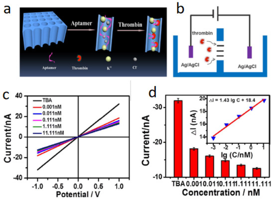Nanochannel-based electrochemical aptasensor. (a) Thrombin immobilized within nanochannels, (b) counter-counter design of the aptasensor, (c) the I–V profiles obtained with different concentrations of thrombin, and (d) the ionic current versus thrombin concentration. Adapted from [97].