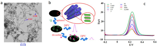 CNT composite-based thrombin aptasensor. (a) TEM images of CNT/ZnCr-LDH nanohybrid, (b) sensing mechanism of the aptasensor, and (c) DPV signals of aptasensor for different thrombin concentrations. Adapted from [112].
