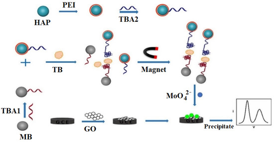 The magnetic properties of MNPs were demonstrated in a study by Zhang et al. [115] via a homogeneous sandwich electrochemical aptasensor. As shown in Figure 9, TBA1 was modified onto the MNPs or magnetic beads (MBs), while TBA2 was immobilized on hydroxyapatite (HAP) nanoparticles. In the presence of thrombin, MNP-TBA1 and HAP-TBA2 sandwich structures formed which could then be collected via a magnetic field, separating out the unconjugated NPs. These sandwich conjugates were then transferred to the electrode surface, where HAP generated a cascade reaction leading to the formation of molybdophosphate precipitate on the electrode surface. The output of this study was a highly sensitive aptasensor, detecting thrombin at concentrations as low as 0.03 fM with a linear range of 0.1 fM to 1.0 nM. This homogeneous design was compared to a heterogeneous version where aptamers were immobilized directly onto the electrode surface. The homogeneous one displayed greater sensitivity and precision, due to the enhanced electron transfer, and minimal steric hindrance brought about by avoiding the presence of large biomolecules on the electrode surface.