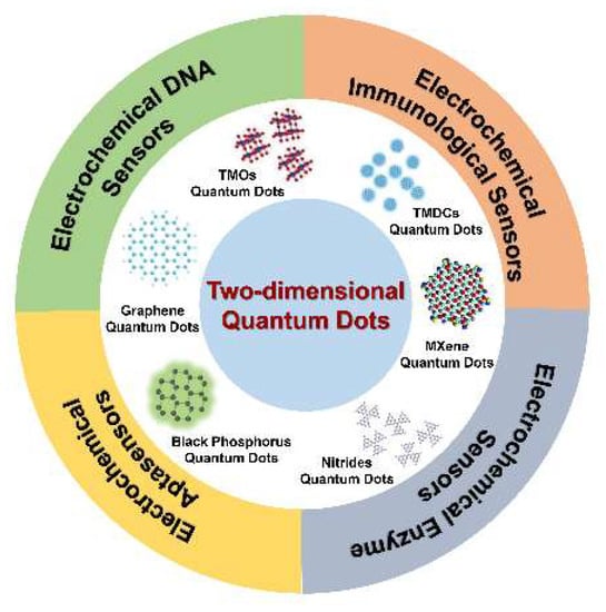 From disease diagnosis to detecting biological agents in the environment, biosensors are closely relevant to our modern life. Among various biosensors, the electrochemical biosensors have demonstrated the advantages of high sensitivity, high signal-to-noise ratio, relative simplicity, and fast response times in the detection of target analytes. The electrochemical biosensors combine the analytical capabilities of electrochemical techniques with the specificity of recognition processes. For the basic principle of electrochemical biosensors, the biomolecules immobilized on electrodes chemically react with analytes to generate or consume ions or electrons, resulting in changes in electrical signals, including potential, current, and impedance. Based on the different molecular recognition elements, the electrochemical biosensors can be mainly classified into electrochemical DNA sensors, electrochemical immunological sensors, electrochemical enzyme sensors, electrochemical aptasensor, and so on. Moreover, the development of nanomaterials provides a wide range of candidates to improve the stability, selectivity, and sensitivity of electrochemical sensors. The versatile nanomaterials can synergistically enhance the catalytic activity, signal transduction, and selectivity of electrochemical biosensors. In particular, the emergence of 2D-nanomaterials provides new opportunities to improve the performance of biosensors. Compared to other nanomaterials, two-dimensional nanomaterials have large specific surface area and excellent optical/electrical properties, making them the preferred choice for sensor design. More importantly, due to the excellent electrical conductivity and high current response sensitivity, 2D-QDs have greatly promoted the development of electrochemical biosensors (Figure 1) [20,21,22,23,24]. Although different 2D-QDs vary in the prominent properties, they share some common features that make them promising for constructing electrochemical biosensors: (1) electrochemical activity; (2) electrical conductivity; (3) large surface-to-volume ratio; (4) ease of functionalization. Due to these properties, the utilization of 2D-QDs in electroanalysis can greatly improve the detection performance.