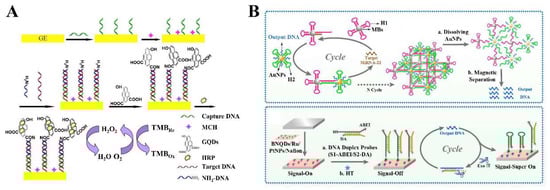 For example, Ghanbari et al. proposed a novel electrochemical aptasensor for highly sensitive detection of streptomycin (STR) based on AuNPs and thiol GQDs (GQD-SH) (Figure 5A) [91]. The AuNPs and GQDs were connected together by Au-S bonds to form the nanocomposites which can be further used to immobilize the aptamers, and the constructed electrochemical aptasensor demonstrated good selectivity and specificity for the determination of STR. However, the stability of this sensor needs to be further improved. Recently, L. Gogola et al. developed a label-free electrochemical aptasensor for the detection of p24-HIV [92]. For the construction of biosensors, GQDs were first immobilized on the SPE by electrodeposition, and the aptamers then linked to the carboxyl group of GQDs via the EDC/NHS reaction. Due to the specific binding of the aptamer to p24-HIV protein, this electrochemical biosensor demonstrated a high selectivity for p24-HIV detection. Khosropour et al. reported an ultrasensitive electrochemical aptasensor for diazinon detection [99]. A new group of nanocomposite (VS2 QDs-graphene nanoplatelets/carboxylated multiwalled carbon nanotubes, VS2 QDs-GNP/CMWCNTs) was prepared to modify the electrode and immobilize the aptamers. Importantly, all of the VS2 QDs, GNP, and CMWCNTs have the ability to increase the surface area and conductivity of electrodes. Due to the synergistic superposition effect of VS2 QDs, GNP, and CMWCNTs, the constructed modified electrode showed the excellent conductivity and high electron transfer rate. When the target diazinon specifically bound to the aptamer, the electron transfer on electrode was limited, resulting in the decrease of the DPV peak current and the enhancement of RCT in EIS. As a result, the established electrochemical aptasensor achieved a high sensitivity for quantitative detection of diazinon with a LOD of 11.0 fM and 2.0 fM using DPV and EIS methods, respectively. Huang and coworkers developed an electrochemical aptasensor based on the Pb2+-dependent DNAzyme-assisted signal amplification (Figure 5B) [93]. The GQDs-IL-NF composite film composed of Nafion, ionic liquid, and GQDs was used to fabricate the electrode, and meanwhile served as a carrier for DNA immobilization through non-covalent π–π stacking interaction. This aptasensor exhibited greatly enhanced sensitivity due to the signal amplification strategy, which achieved good linearity for CEA detection in the range of 0.5 fg mL−1 to 0.5 ng mL−1 with a detection limit as low as 0.34 fg mL−1.