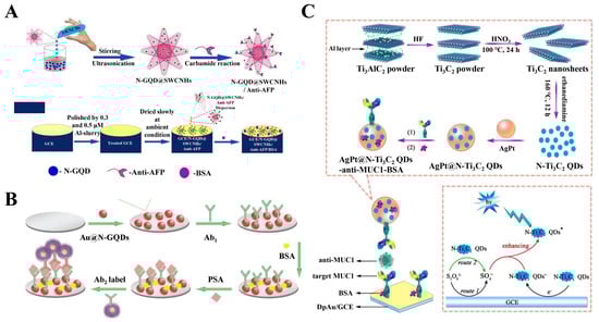 The 2D-QD-based electrochemical immunological sensors. (A) Preparation of N-GQD@SWCNHs/anti-AFP bioconjugates and construction of immunological sensors for the detection of AFP. Adapted with permission from Ref. [105]. Copyright 2021 American Chemical Society. (B) Construction of the sandwich-type immunological sensor for PSA detection using Au@N-GQDs as the substrate material of electrodes and Au@Ag-Cu2O as the labels. Adapted with permission from Ref. [80]. Copyright 2018 Elsevier. (C) Synthesis of AgPt@N-Ti3C2 QDs-anti-MUC1-BSA bioconjugates and fabrication of ECL immunological sensor for the detection of MUC1. Adapted with permission from Ref. [24]. Copyright 2022 Elsevier.