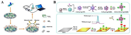 The 2D-QD-based electrochemical enzyme biosensors. (A) Fabrication of PEDOT:PSS/Ti3C2/GQD modified SPCE for glucose detection. Adapted from Ref. [87]. (B) Preparation of GOx-CeO2@Ag-GQDs and construction of the ECL biosensor. Adapted with permission from Ref. [90]. Copyright 2019 Elsevier.