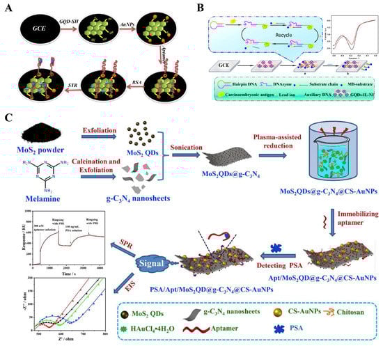 For example, Sun et al. reported a novel electrochemical immunological sensor based on the polyaniline functionalized GQDs (PAGD) for the detection of the heat shock protein 70 (HSP70) [79]. The PAGD composites were prepared using GQDs and aniline as precursors, which were further dropped on the surface of GCE to obtain PAGD/GCE electrode. Compared with GQDs, PAGDs exhibited better electrical conductivity, which can increase the electron transfer rate on the electrode and improve the sensitivity of the biosensor. Then, the PAGD/GCE electrode was incubated with the HSP70 sample to obtain the HSP70/PAGD/GCE basic electrode, which was then incubated with the biotin HSP70 antibody and horseradish peroxidase conjugate streptavidin (HRP-Strept) in sequence. Finally, the electrochemical immunological sensor (HRP-Strept-Biotin-Ab-HSP70/PAGD/GCE) was fabricated. Since HSP70 in the sample can compete with the HRP-labeled HSP70 antibody, the concentration of HSP70 in the sample is negatively correlated with the detection signal of the electrochemical immunological sensor. Under the optimized conditions, HSP70 can be sensitively determined in the range of 0.0976–100 ng/mL with a LOD of 0.05 ng/mL. Recently, an electrochemical immunological sensor was developed by Dutta et al. based on the N-GQDs and single-walled carbon nanohorns (SWCNHs) for the determination of α-fetoprotein (AFP) (Figure 3A) [105]. By assembling N-GQDs and SWCNHs, a hybrid architecture (N-GQD@SWCNHs) was obtained and used to immobilize primary antibodies, anti-AFP. The electrochemical immunological sensor was fabricated by distributing the bioconjugates (N-GQD@SWCNHs/anti-AFP) dispersion on the surface of GCE. Notably, the conductivity and sensitivity of this electrochemical immunological sensor were significantly improved due to the cooperation of N-GQDs and SWCNHs. As a result, a good linear relationship was observed between the cathodic and anodic peak currents and the concentration of AFP from 0.001 to 200 ng mL−1 with a LOD of 0.25 pg mL−1. In addition, a label-free method for electrochemical ferritin sensing using WS2 QDs was reported by Garg and coworkers [45]. In this work, WS2 QDs were used for the modification of SPE and as the carriers for the ferritin antibody immobilization. Due to the specific recognition of ferritin antibodies to ferritin, the prepared immunological sensor has high selectivity and reproducibility for the detection of ferritin.