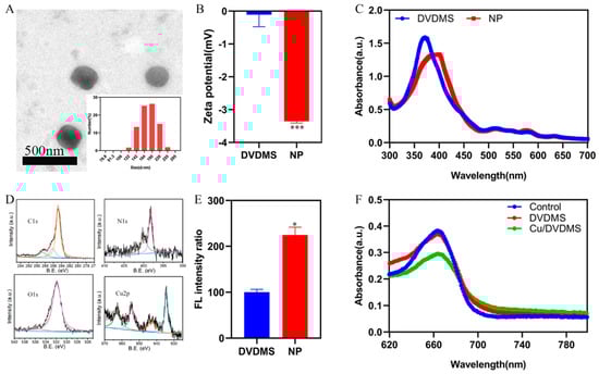 (A) DLS and TEM images of Cu/DVDMS. (B) Zeta potential of DVDMS and Cu/DVDMS (n = 3, mean ± SD). (C) UV−Vis absorption of DVDMS and Cu/DVDMS. (D) XPS wide scans of Cu/DVDMS. (E) ROS generation of DVDMS and Cu/DVDMS by DCFH-DA probes under ultrasound treatment (n = 3, mean ± SD). (F) Degradation of MB under different conditions in dark, * p < 0.05, *** p < 0.001.