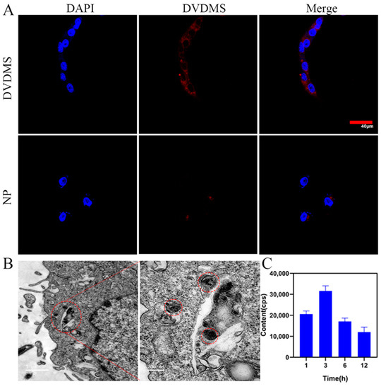 The 4T1 cancer cells were seeded into the confocal dish at a density of 104 cells/well and cultured for 12 h. DVDMS and Cu/DVDMS were added and co-cultured separately for 3, 6, and 12 h. Then, the free DVDMS or Cu/DVDMS were wiped out by removing the culture medium and washed with PBS for three times. Paraformaldehyde (POM, Sigma-Aldrich, St. Louis, MO, USA) was used to fixate the cells for 15 min and removed. For the fluorescence imaging study, a solution containing 4′,6-diamidino-2-phenylindole (DAPI, Sigma-Aldrich, St. Louis, MO, USA) was added to the cells and the cells were observed by a confocal laser scanning microscope (CLSM, Olympus, Tokyo, Japan). Copper ions quantitatively were measured by inductively coupled plasma atomic mass spectrometry (ICP-MS, SPECTRO, Massachusetts, USA) at 1, 3, 6, and 12 h. The 4T1 cancer cells incubated with DVDMS or Cu/DVDMS for 12 h were collected for TEM.