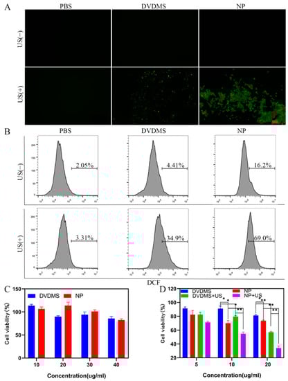 The biosafety of Cu/DVDMS was evaluated on 293T cells by using the typical 3-(4,5-dimethyl thiazol-2-yl)-2,5-diphenyltetrazolium bromide (MTT) protocol. The cell viability of 293T cells was detected after 24 h of incubation with Cu/DVDMS or DVDMS. As shown in Figure 3C, the prepared nanostructures showed no obvious cytotoxicity—even at a concentration of 40 µg/mL—compared with free DVDMS, demonstrating their excellent biocompatibility. Further in vitro SDT/CDT effects of Cu/DVDMS were evaluated on 4T1 cancer cells using the standard MTT assay. As shown in Figure 3D, cell viability decreased when the cells were treated with Cu/DVDMS, DVDMS+US, and Cu/DVDMS+US at different concentrations. The results showed that Cu/DVDMS possessed excellent CDT effects after the nanoparticles entered the cell, and the group treated with Cu/DVDMS+US possessed the best treatment effect, showing that Cu/DVDMS+US had an excellent capability for producing ROS damage in cancer cells.