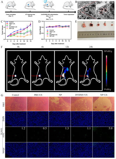 We continued to investigate in vivo treatment effects by injecting Cu/DVDMS or DVDMS into different groups. The studies of different treatments were performed using 4T1 tumor-bearing mice, and in vivo tumor inhibition effect was evaluated by dynamically monitoring the changes in tumor volume. As shown in Figure 4A, in vivo therapeutic study was performed when the tumors volume reached ≈100 mm3 (approximately 7 days after inoculation). Cu/DVDMS or DVDMS was injected into the mice, and some groups were treated with ultrasound after 12 h post-injection at 1, 3, and 7 days, respectively. As shown in Figure 4C,E, the mice treated with PBS+US exhibited rapid tumor growth, which aligned with the results of the control group, indicating the insignificant antitumor effect of PBS+US groups. It was implied that ultrasound alone did not produce the inhibitory effects. The group treated with Cu/DVDMS and DVDMS+US could partially inhibit tumor growth within 14 days. The tumor volume of Cu/DVDMS+US group had a significant difference compared with Cu/DVDMS and DVDMS+US group, indicating the group treated with Cu/DVDMS+US possessed the optimal therapeutic effect relative to other treatment groups. As a whole, it was indicated that Cu/DVDMS can be applied as a nanomaterial for effective inhibition of tumor growth when exposed to US, which was related to excellent tumor accumulation, Fenton-like reaction, and greater ROS production of Cu/DVDMS.