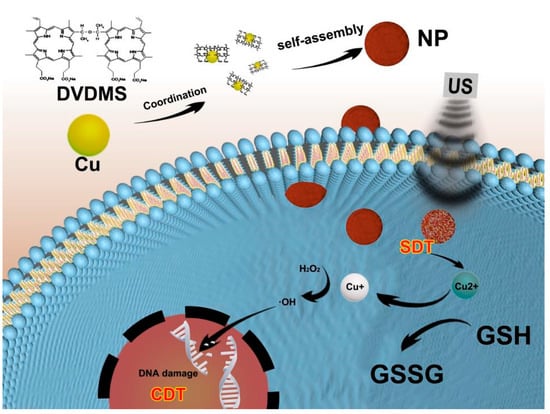 Additionally, self-assembly induced by metal ions is also a research hotspot and allows for the facile combination of imaging and therapy. Multi-functional nanocomposites can be obtained by inducing self-assembly among multiple components and further modification to realize effective integration of diagnosis and treatment [14,15]. Studies found that utilizing metal to realize DVDMS self-assembly was an impressive attempt to improve the SDT efficiency. Some researchers chelated manganese ions with DVDMS to form nanoparticles to enhance the SDT effect [16]. In addition, it was found that metal oxides could also be assembled with DVDMS to enhance treatment efficacy [17]. Studies found that SDT mediated by DVDMS produced its effects mainly by inhibiting the PI3K/AKT/mTOR signaling pathway [18].