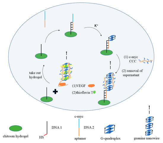 In this work, chitosan hydrogel modified by a double bond was firstly synthesized, as shown in Figure S2. Then, the thiol modified DNA1 was grafted onto the chitosan hydrogel film through click chemistry reaction. DNA2 containing c-myc and VEGF aptamer was then added into the system. The VEGF aptamer part hybrids with DNA1, and c-myc part forms the G-quadruplex under the action of K+. Further, in the presence of chaperone polymer PLL-g-Dex, G-quadruplex rapidly folds into extended G-wires. When the target protein VEGF is present, the complex of aptamer/VEGF is induced, and the G-wires are released from the gel. After centrifugation, specific dye ThT was added into the upper clear solution, and G-wires combined with ThT to produce a strong fluorescence signal. In the absence of VEGF, G-wires cannot be released from the gel, and fluorescence signals are relatively weak, as shown in Figure 5A. After centrifugation, the chitosan hydrogel was washed thoroughly with excess Milli-Q ultrapure water, and thus could be reused next time.