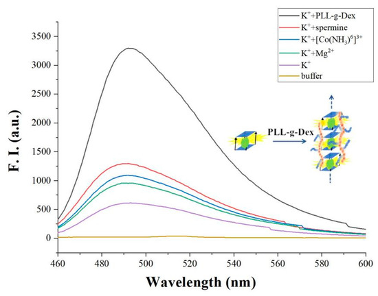 The fluorescence intensity of adding different cations ([c-myc] = 2 μM, [ThT] = 2 μM, [K+] = 50 mM, [Mg2+] = 1 mM, [Co(NH3)6]3+ = 1 mM, spermine = 1 mM, PLL-g-Dex = 0.1 μM).