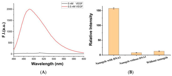 (A) Fluorescence spectrum of the platform ([ThT] = 2 μM, [gels] = 0.15 mg/mL, [K+] = 50 mM, [PLL-g-Dex] = 0.1 μM, [c-myc] = 2.0 μM) with (0.5 nM) or without VEGF. (B) Fluorescence signal of the VEGF (0.02 nM) detection system with or without DNA1, or without chitosan hydrogel. Error bars represent the standard deviation of the measurement (n = 3).