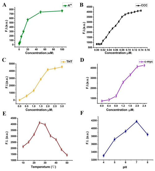 Fluorescence intensity of the system. Error bars represent the standard deviation of the measurement (n = 3). (A) different concentrations of K+ (0–100 mM); (B) different concentrations of PLL-g-Dex (0.005–0.14 µM); (C) different concentrations of ThT (0–3 µM); (D) different concentrations of c-myc (0–2.4 µM); (E) different temperatures (10–50 °C); (F) different pH (4, 5, 6, 7 and 8).