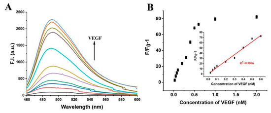 (A) Fluorescence spectra of the platform with 0.025, 0.05, 0.075, 0.1, 0.2, 0.3, 0.5, 1.0, 1.5, and 2.0 nM of PDGF-BB. (B) The relationship between fluorescence intensity at λ = 490 nm and VEGF concentrations. Inset: The standard curve of VEGF detection. Error bars represent the standard deviation of the measurement (n = 3).