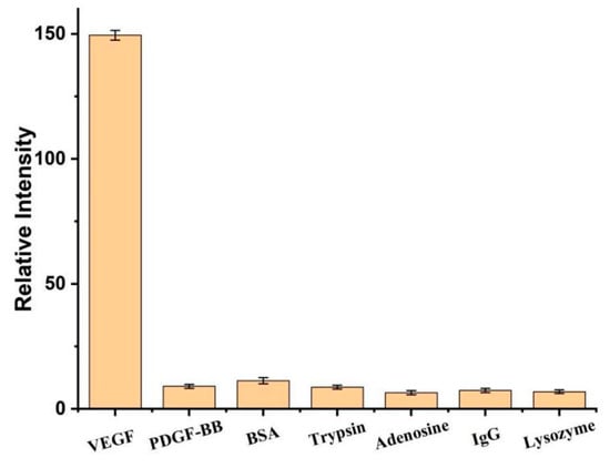 Relative fluorescence intensity of 0.1 nM VEGF or 10-fold excess amount of other proteins. Error bars represent the standard deviation of the measurement (n = 3).