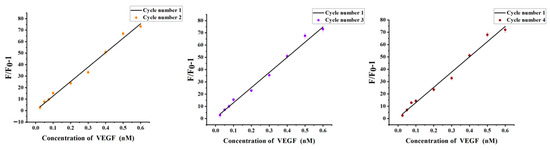 The chitosan hydrogel was collected by centrifugation and redispersed in the new solution. After washing with excess Milli-Q ultrapure water, the hydrogel was collected and recycled. 0.025–0.6 nM of VEGF was added to verify the sensitivity of the recovered hydrogel. The results showed that the fluorescence intensity in 490 nm combined with the above standard curve equation, indicating that the hydrogel has almost recovered to its original structure. In addition, there was no significant difference in the standard curve of the four cycles, as shown in Figure 9. So, chitosan hydrogel can be used as a carrier many times.