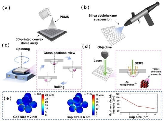(a) Schematic diagram of concave dome array preparation; (b) schematic diagram of superhydrophobic surface coating; (c) schematic diagram of working mechanism of dynamic enrichment on SCDA; (d) schematic diagram of surface-enhanced Raman scattering (SERS) detection on SCDA; (e) numerical simulation of electric field intensity of Ag nanoparticles with different gap sizes in three-dimensional space.