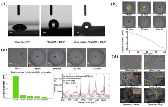 Several smart methods used to prepare the superhydrophobic surfaces are reported that can enrich the mixture of the plasmonic nanoparticles and analytes. For example, a nanotexture surface infiltrated with a perfluorinated liquid to form the slippery liquid-infused porous surface (SLIPS) can concentrate the analytes and plasmonic particles for attomole-level detection [15]. Any disturbance will cause the droplets to slip away from the surface due to the superhydrophobicity. Therefore, a superhydrophobic and magnetically functionalized surface was developed by spraying silica nanoparticles onto the surface of a magnetorheological elastomer, where several droplets can steadily stand in the magnetically-induced deformation area [16,17]. Unfortunately, the functionalized surface is unable to process abundant droplets simultaneously due to the interference of the magnets. Therefore, it is still challenging to develop a facile and efficient way to achieve multi-droplet manipulation to prepare the scalable SERS hotspots for multiplexing detection.