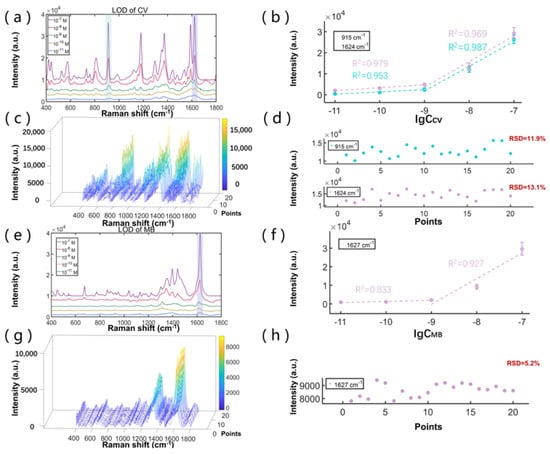 To further study the limit of detection (LOD) and the signal uniformity of the dynamic enrichment mode of SCDA, we used CV and MB, respectively, as the probe molecules to prepare multiple detection hotspots with different concentrations of these two molecules on the same SCDA. Figure 3a,e shows the SERS signals for different molar concentrations, ranging from 10−7 M to 10−11 M, while Figure 3c,g shows the SERS signals for 20 randomly chosen positions when the molar concentration is at 10−8 M.