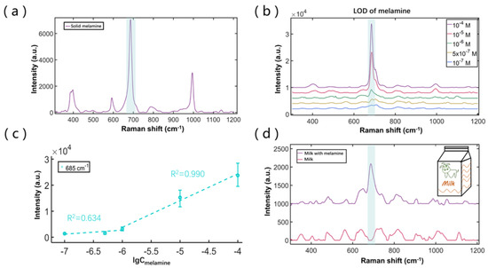 To verify the feasibility of SCDA application in the field of food safety, we performed the SERS study by mixing melamine into milk as the sample. In a controlled experiment, the Raman spectrum of solid melamine was first measured by ourselves (Figure 4a) to identify the characteristic peaks of 685 cm−1 (associated with ring breathing mode II of the in-plane triazine ring). We then measured the SERS signals of melamine solutions at the various concentrations, as shown in Figure 4b,c. The results show that the LOD is about 5 × 10−7 M. From Figure 4c, the intensity points can also be separated into two linearly fitting regions, with the higher concentration region as Y685cm−1 = 10281·lgCmelamine + 65484, and the lower concentration region as Y685cm−1 = 1546·lgCmelamine + 12009. The results imply that the SCDA can be used for quantitative analysis when the concentration of melamine is higher than 10−6 M.