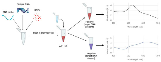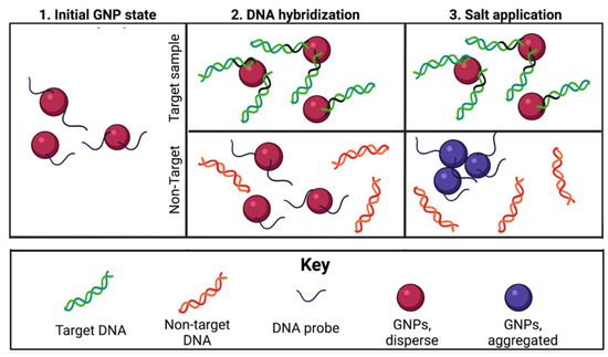 GNP colorimetric biosensors rely on the visible color change of a solution due to the aggregation of GNPs. Methods with non-target aggregation typically use one probe sequence attached to GNPs that will bind to target DNA [24]. After DNA hybridization has occurred, a salt is added to the solution. GNPs are typically coated with adsorbed negative ions such as citrate or dextrin, whose electrostatic repulsion prevents particle aggregation; however, introduction of a salt to the colloid GNPs is known to disrupt these forces and induce particle aggregation [18,25,26]. While GNP–probe complexes bound to target DNA are protected from aggregation and remain red in color, samples without target DNA will aggregate and turn purple or blue [23,27]. This generalized mechanism is outlined in Figure 1.