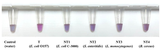 After optimization, specificity of the biosensor was analyzed. Each specificity trial included one water control, one target sample (E. coli O157), and four non-target species and strains: E. coli C-3000 (NT1), S. Enteritidis (NT2), L. monocytogenes (NT3), and B. cereus (NT4). All DNA samples were tested at a concentration of 10 ng/µL. Visual results are displayed in Figure 4.