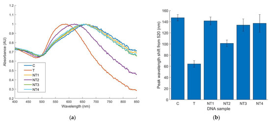 (a) Normalized average absorbance spectra for 9 replicates of E. coli O157 biosensor; (b) E. coli O157 specificity results analyzed by peak wavelength shift from 520 nm and conducted with 10 ng/µL of DNA, 9 replicates per sample (n = 9). Error bars represent 95% confidence intervals. (C, water; NT1, E. coli C-3000; NT2, S. Enteritidis; NT3, Listeria spp.; NT4, B. cereus).