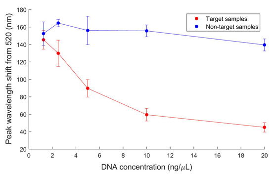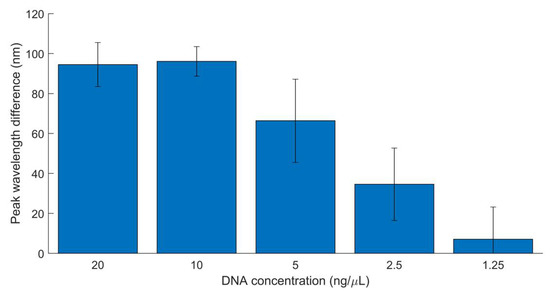Sensitivity results also indicate that, while the biosensor can detect as high as 20 ng/µL (the highest concentration tested), the linear range of detection is between 2.5 and 10 ng/µL. Above 10 ng/µL, the data appear to show a hook effect, in which a high concentration of a biosensor’s target ligand compared to the capturing molecule leads to decreased or no detection [43,44]. In this case, the DNA concentration (target ligand) most likely oversaturates the probe concentration (capturing molecule), leading to the stagnation of peak wavelength difference shown at 20 ng/µL. If higher concentrations were tested, it is predicted that peak wavelength difference may begin to significantly decrease.