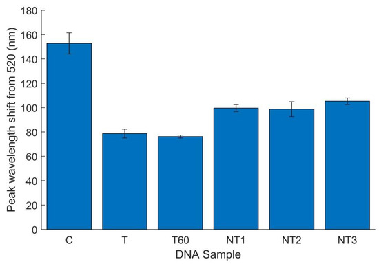 To establish a proof of concept for this biosensor’s applicability in food matrices, approximately 103 CFU/mL bacteria was extracted from artificially inoculated flour samples using MNPs. After 4 h of growth, DNA was extracted from the sample for implementation in the biosensor. In addition to E. coli O157-inoculated flour, DNA was extracted from flour inoculated with other foodborne pathogens (E. coli C-3000, NT1, and L. monocytogenes, NT2). Thus, testing simulated a situation in which only one bacterial species or strain was present in the food or sample purification steps had been taken. These samples were tested alongside a water control and one DNA sample extracted from magnetically separated flour that had not been artificially contaminated (NT3). DNA extractions from flour not inoculated produced a DNA concentration of 55.6 ng/µL, while the E. coli O157-contaminated flour sample produced a concentration of 83.4 ng/µL. Thus, it may be assumed that this difference (approximately 28 ng/µL) is equivalent to the E. coli O157 DNA concentration in the target sample. Although variability in DNA yields must be acknowledged, this offers an estimate of the true target DNA concentration. To confirm that positive results for target samples were not due to a higher total DNA concentration, all initial DNA concentrations from flour were tested in the biosensor along with a sample of the E. coli O157-containing DNA diluted to 60 ng/µL (T60). Figure 8 displays the mean peak wavelength shift for the six replicates conducted, with error bars representing 95% confidence intervals.