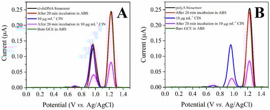 (A) DP voltammograms of the ct-dsDNA biosensor, 10 μg mL−1 CIN, the ct-dsDNA biosensor after incubation in ABS (pH 4.7), the ct-dsDNA biosensor after incubation in 10 μg mL−1 CIN, and the bare GCE in ABS (pH 4.7), (B) DP voltammograms of polyA biosensor, 10 μg mL−1 CIN, the polyA biosensor after incubation in ABS (pH 4.7), the polyA biosensor after incubation in 10 μg mL−1 CIN, and the bare GCE in ABS (pH 4.7).