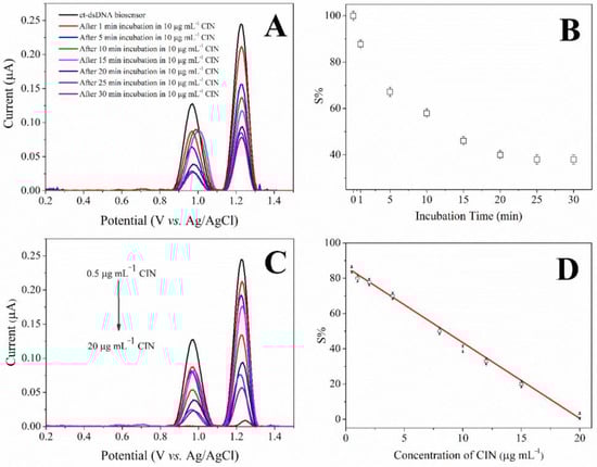 The DPV anodic oxidation peak current of the dAdo was expressed as the relative value (S%) using the following Equation (1) and compared to that obtained at the ct-dsDNA biosensor before the interaction with CIN.