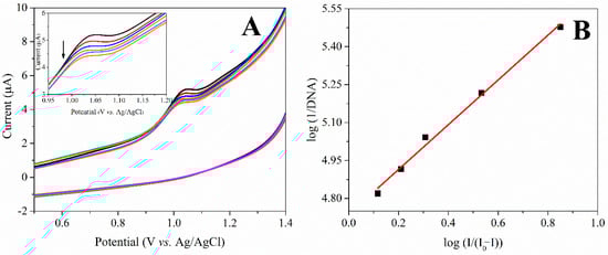 For a better understanding of the CIN-ct-dsDNA interaction and to determine the binding constant, an electrochemical investigation was performed in ABS (pH 4.7) using the CV method at ambient temperature [34]. When previous studies were examined, no anodic peaks were observed in the CV of ct-dsDNA in ABS (pH 4.7) [18,35]. Additionally, the CV peak current of 10 μg mL−1 CIN was found as 1.018 V. In order to observe the interaction mechanism of the CIN-ct-dsDNA, 10 µg mL−1 CIN solution was prepared in ABS (pH 4.7). Subsequently, successive ct-dsDNA concentrations in the range of 3.30 × 10−6 M–1.50 × 10−5 M were added to this solution to monitor the changes in the CV responses of CIN. It was observed that the peak current of CIN gradually decreased in the buffer solution while the increased ct-dsDNA concentrations were added to the CIN solution (Figure 4A). Based on the changes in the oxidation signal of CIN after binding to ct-dsDNA, the binding constant (K) value was determined using the following Equation (2);