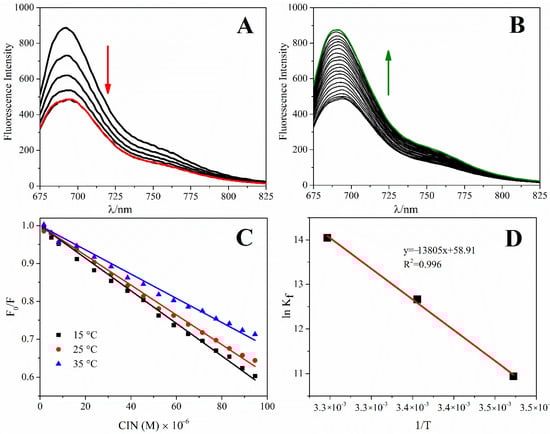 Spectrofluorometric methods have been widely preferred for investigating the interaction between small organic and inorganic molecules, and dsDNA by performing fluorescence titration studies. Changes in the fluorescence signals of the molecules or dsDNA are followed to explore the interaction [43]. In the present study, the displacement approach, as a competitive approach, was used for fluorescence titrations using MB as an indicator. This approach was based on adding a molecule with higher affinity than the indicator molecule onto the dsDNA-indicator complex and replacing the indicator from the complex with the molecule by fluorescence recovery [43]. In this study, the fluorescence spectra of MB at a fixed concentration were quenched upon the addition of increasing ct-dsDNA concentrations, and it was concluded that all MB in the media bound to ct-dsDNA at the point where the signal remained constant. In the next step, increasing concentrations of CIN (3.3 × 10−7 M–1.9 × 10−5 M) were added to the ct-dsDNA-MB complex, the ct-dsDNA interacted with CIN and replaced MB, and the fluorescence signal was recovered. As shown in Figure 5A,B, a remarkable enhancement of MB + ct-dsDNA fluorescence intensity was observed with increasing concentrations of CIN. In general, the fluorescence enhancing mechanism could be categorized either as static, dynamic, or mixed quenching based on temperature. Therefore, the indicator displacement experiments were performed at three different temperatures (288 K, 298 K, and 308 K) to investigate the thermodynamic parameters. The change in fluorescence emission intensity in enhancer molecules is based on collision between molecules (dynamic) or formation of the ground-state complex (static). The Stern–Volmer constant (KD) determines the types of enhancing mechanisms (static, dynamic, or mixed quenching) involved in the interaction process. The fluorescence enhancement of CIN-ct-dsDNA was described by using the classical Stern–Volmer Equation (3) [44]: