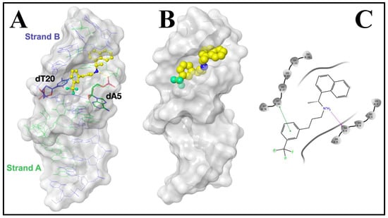 The binding of drugs to DNA plays a critical role in new drug discovery and is important for designing better drugs. In this study, the interaction and binding mode of calf-thymus double-stranded deoxyribonucleic acid (ct-dsDNA) with cinacalcet (CIN) from the calcimimetic drug that mimics the action of calcium on tissues group were investigated. The interaction of CIN with ct-dsDNA was observed by the differential pulse voltammetry (DPV) technique by following the decrease in electrochemical oxidation signals to deoxyguanosine and adenosine. A competitive study was performed on an indicator, methylene blue, to investigate the interaction of the drug with ct-dsDNA by fluorescence spectroscopy. Interaction studies have shown that the binding mode for the interaction of CIN with ct-dsDNA could be groove-binding. According to the results obtained, the binding constant values were found to be 6.30 × 104 M−1 and 3.16 × 105 M−1, respectively, at 25 °C as obtained from the cyclic voltammetry (CV) and spectroscopic techniques. Possible molecular interactions of CIN with dsDNA were explored via molecular docking experiments. The docked structure indicated that CIN could fit well into the minor groove of the DNA through H-bonding and π-π stacking contact with CIN.