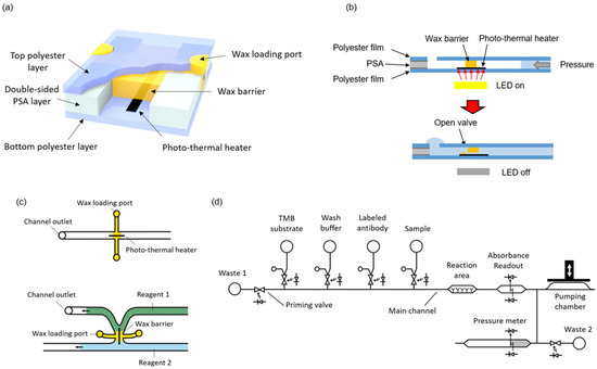 (a) A 3D illustration of the valve structure; (b) Cross-sectional representation of the valve opening; (c) Two different configurations of the wax valve; (d) Complete fluidic schematic of the ELISA chip.