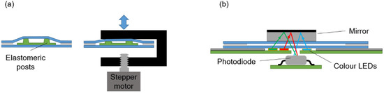 The pressure required to move the fluids inside the chip is provided by a pumping chamber, which is actuated with an external stepper-motor linear actuator integrated in the instrument. An array of polydimethylsiloxane (PDMS) elastomeric posts inside the chamber enables expansion of its internal volume when the actuator is moved upwards, so that both positive and negative pressure can be generated (Figure 2a).