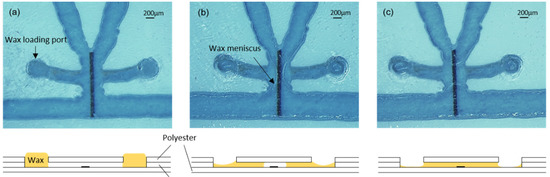 (a) Valve with wax-loading port full of wax; (b) Penetration of the wax inside the channel by capillarity; (c) Formation of the wax barrier on top of the heater. Bottom drawings are cross-sectional illustrations of the process.